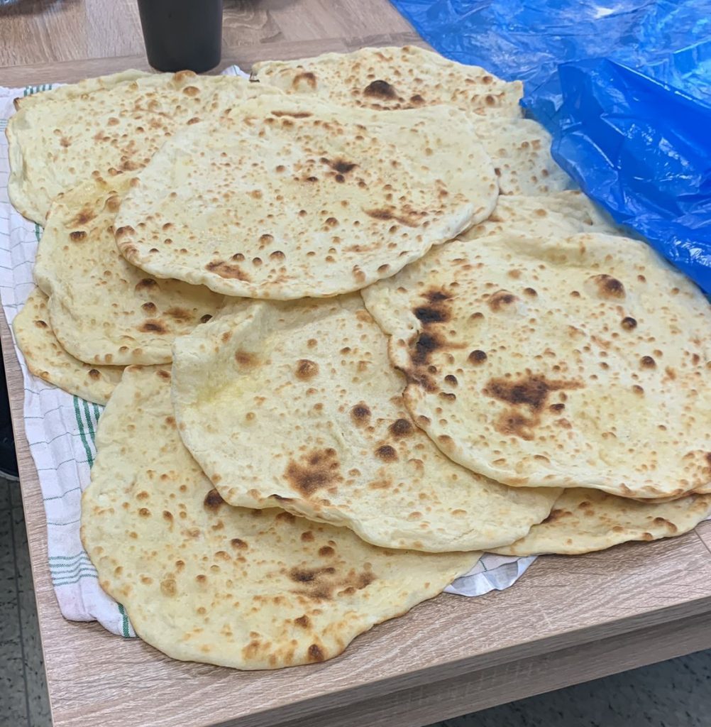 Unsere Vereinslotsin hat wie immer die benötigten frischen Lebensmittel zum Brotbacken besorgt. Die Frauen haben dann unter der Anleitung einer kurdisch-yesidischen Teilnehmerin zunächst den Teig zusammengestellt.